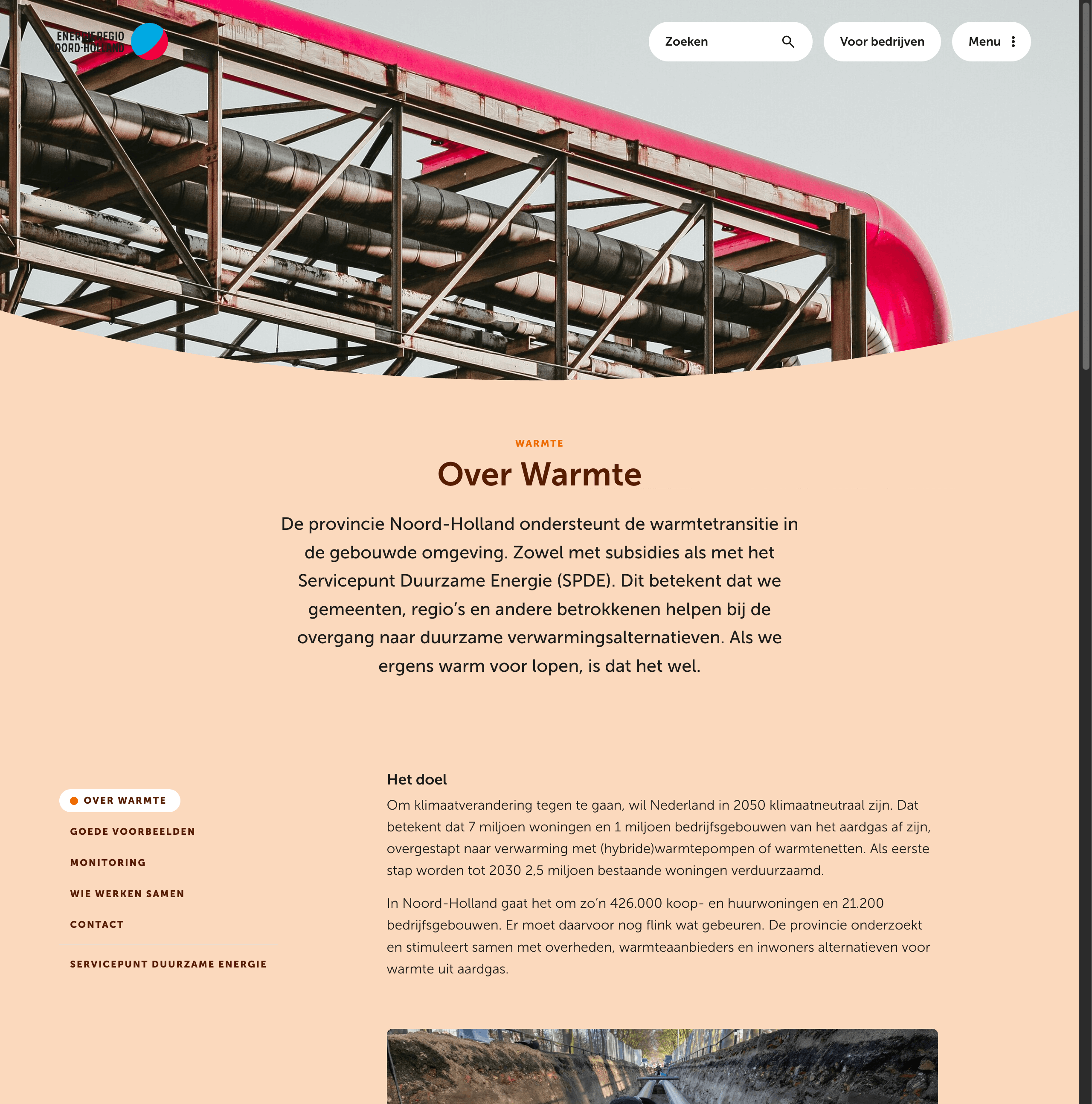 Op deze pagina staat onder de kop “Noord-Hollandse aanpak van de warmtetransitie” de linktekst “In de Noord-Hollandse klimaataanpak”. Deze tekst wordt visueel als één doorlopende link gepresenteerd, maar is in de code opgesplitst in twee aparte a-elementen die allebei naar dezelfde bestemming verwijzen.