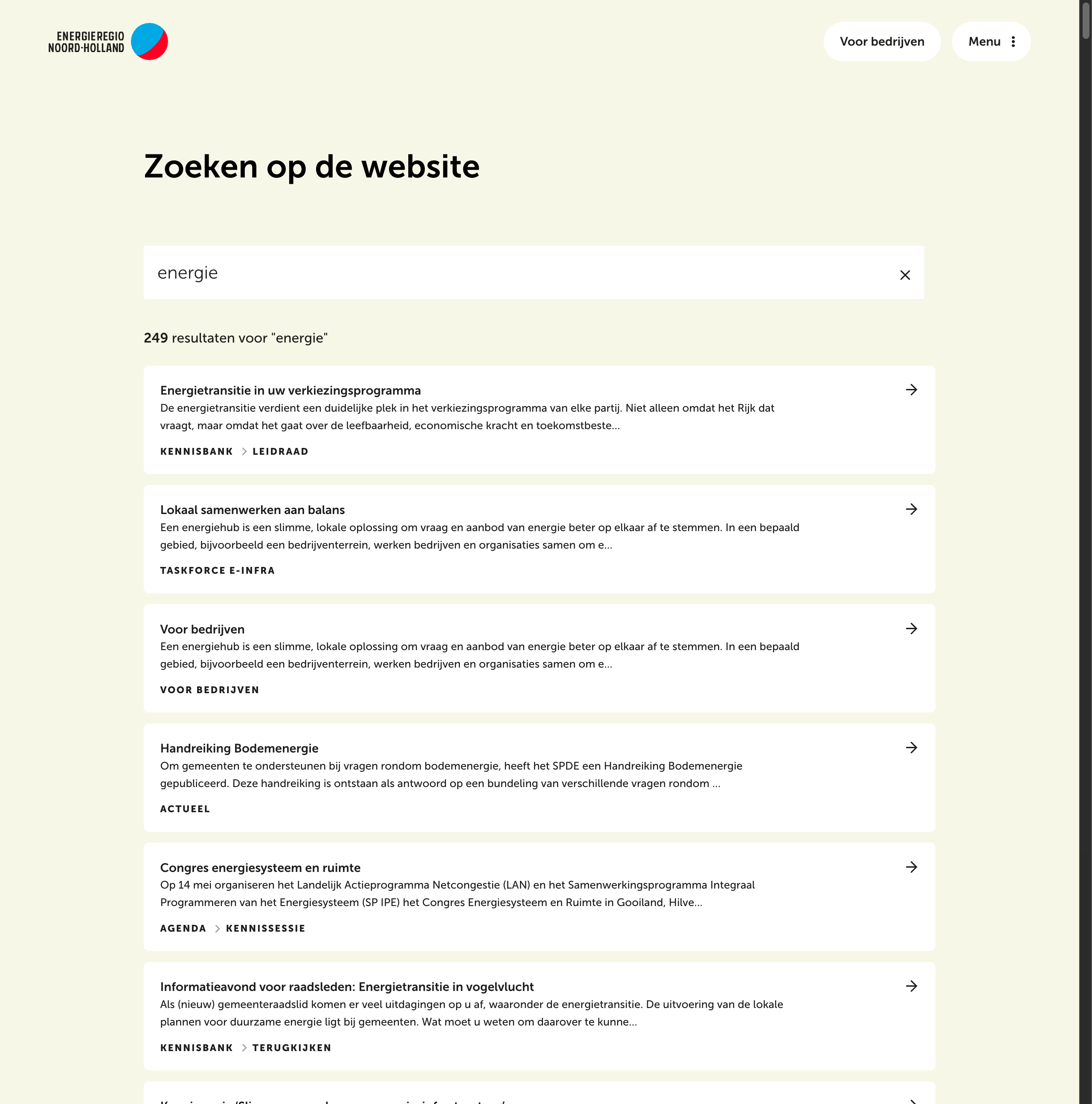 Op deze pagina zijn de teksten in de zoekresultaten niet opgemaakt als koppen. Het gaat bijvoorbeeld om "Energietransitie in uw verkiezingsprogramma", "Lokaal samenwerken aan balans", "Voor bedrijven" en andere teksten.