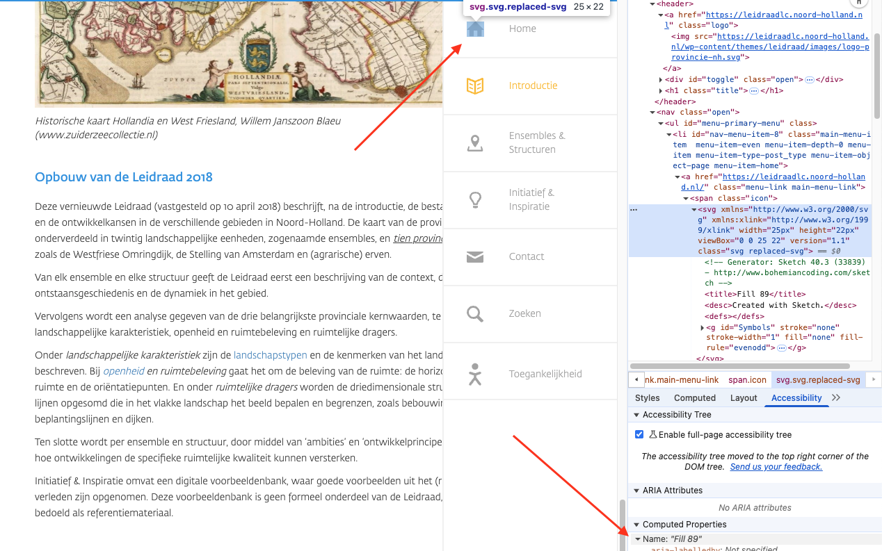 In het menu staan decoratieve afbeeldingen voor elk item. Het huispictogram heeft bijvoorbeeld de tekstalternatief 'Fill 89' en het boekpictogram naast 'Introductie' heeft de tekstalternatief 'Fill 232'.