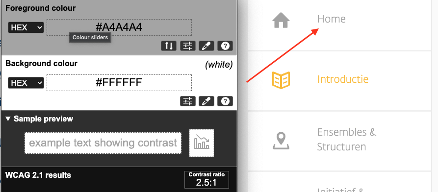 Kleurcontrast van tekst is te laag (tekst kleiner dan 24px en niet vetgedrukt)