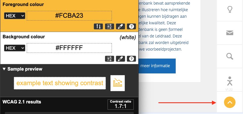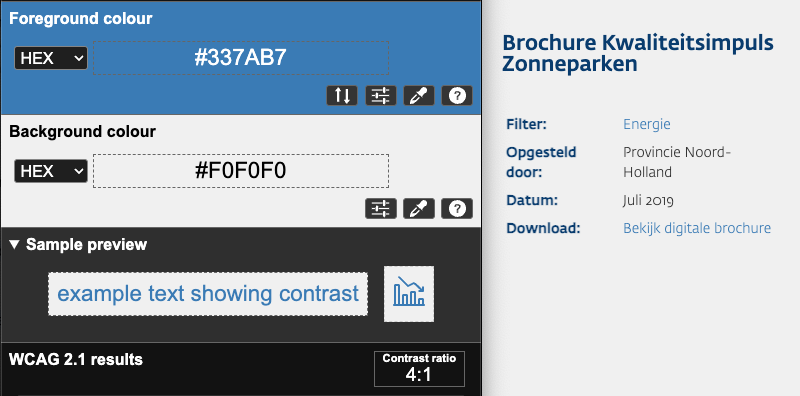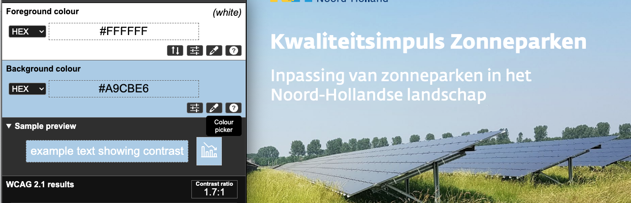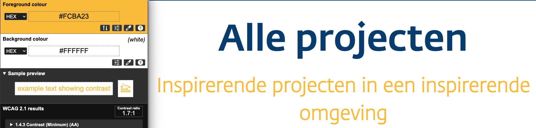 Op deze pagina staat een gele tekst (#FCBA23) "Inspirerende projecten in een inspirerende omgeving" op een witte achtergrond. De kleurcontrastverhouding is te laag: 1,7:1. De witte tekst op een blauwe achtergrond (#2891E1), zoals "Brochure Kwaliteitsimpuls Zonneparken" heeft een contrastverhouding van 3,4:1.