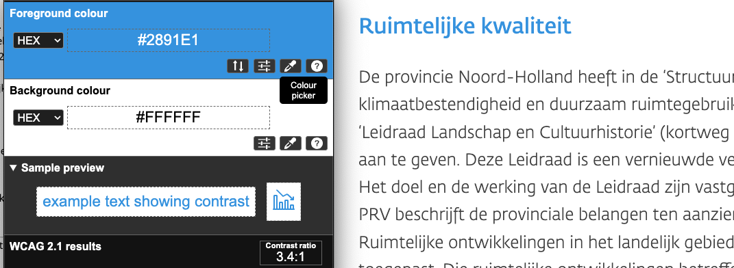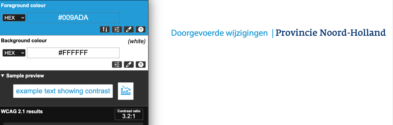 Voor tekst met een lettergrootte tot 24 px of vetgedrukt moet deze minimaal 4,5:1 zijn, en voor grote tekst vanaf 24 px of vetgedrukt minimaal 3,0:1. Op deze pagina staat een instructie die uitlegt hoe je kleurcontrast kan testen: https://properaccess.nl/hoe-test-ik-kleurcontrast/.