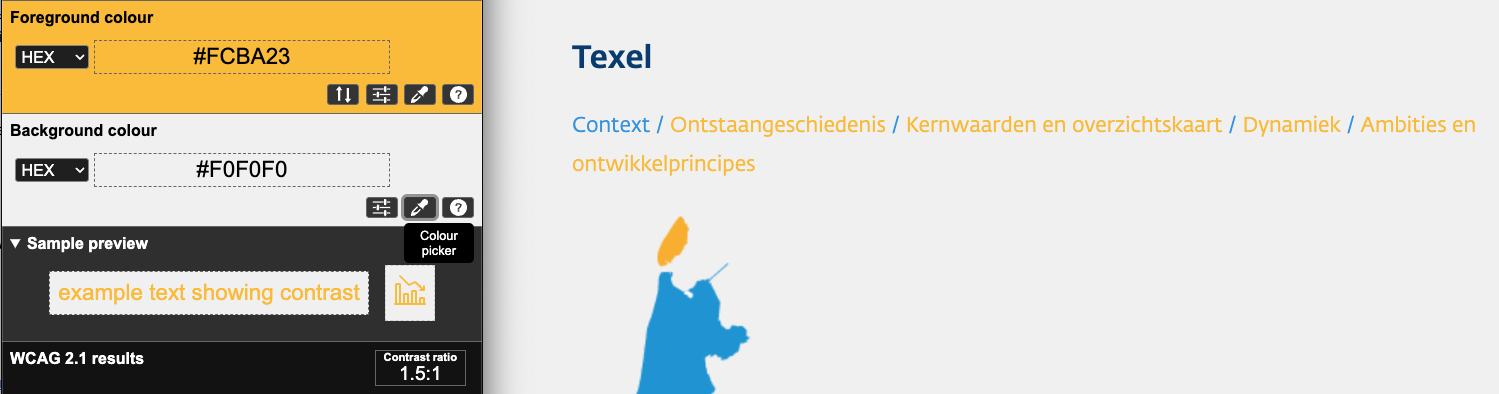 Op deze pagina hebben de teksten in het broodkruimelpad onvoldoende kleurcontrast. De gele tekst (#FCBA23) tegen de grijze achtergrond (#F0F0F0) heeft een contrastverhouding van 1,5:1, wat lager is dan de vereiste 4,5:1 voor tekst van standaardgrootte.