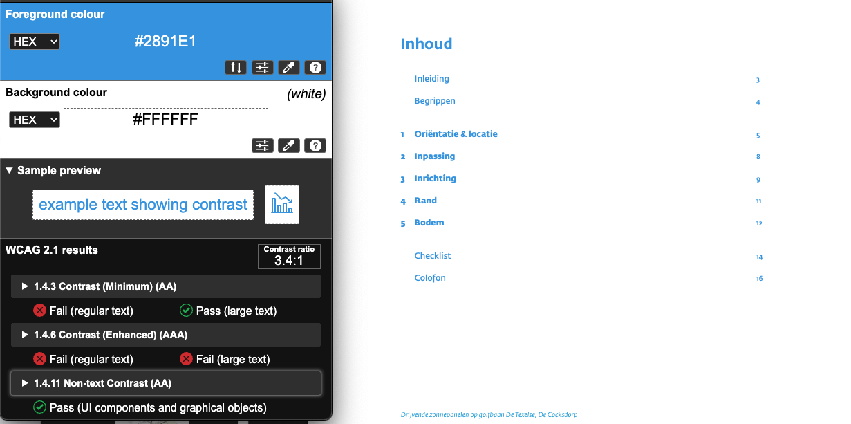 In dit pdf-document staat overal blauwe tekst (#2891E1, #0093D6) op een witte achtergrond, zie bijvoorbeeld pagina's 2-6. De kleurcontrastverhouding is te laag: 3,4:1.