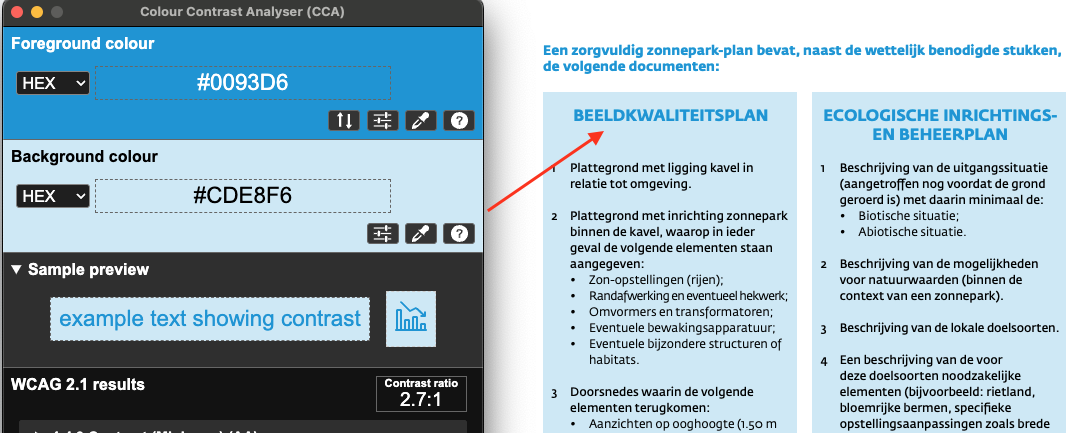 Hetzelfde probleem doet zich voor bij combinaties van blauwe tekst (#0093D6) op een blauwe achtergrond (#CDE8F6) op pagina 16 en witte tekst (#A9CBE6) op een blauwe achtergrond op pagina 1.