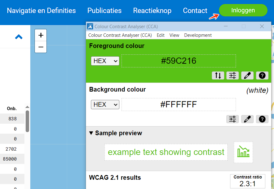 Op deze pagina verandert in het hoofdmenu de tekst van de link “Inloggen” naar wit op een lichtgroene achtergrond (#59C216) wanneer de link wordt aangewezen met de muiscursor. De contrastratio van deze tekst is 2,3:1. Tekst van informatieve elementen zoals links en knoppen moet altijd voldoende contrast hebben, ook wanneer het element toetsenbordfocus krijgt of wanneer de bezoeker er met de muiscursor over beweegt (hover).