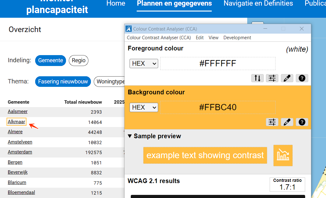 Op deze pagina wordt een aangepaste toetsenbordfocus gebruikt, weergegeven door een gele rand (#FFBC40). Op witte, grijze (#EEEEEE) en blauwe (#0076D0) achtergronden heeft deze focus te weinig contrastratio: respectievelijk 1,7:1, 1,4:1 en 2,8:1, bijvoorbeeld bij de links in het hoofdmenu.