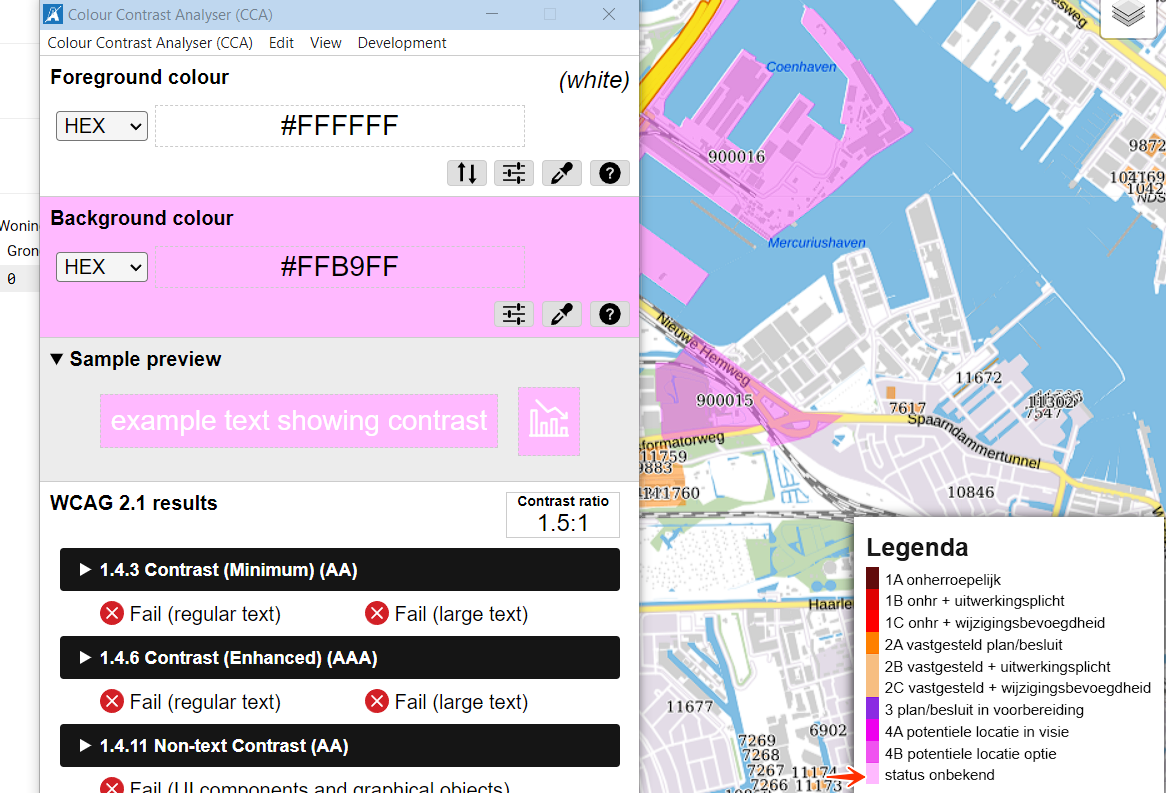 Op deze pagina staat een kaart met een legenda. Sommige kleuren hebben een laag kleurcontrast, bijvoorbeeld: op een witte achtergrond heeft lichtpaars (#FFB9FF) een contrastratio van 1,5:1, paars (#F053F0) 2,9:1, lichtoranje (#F7BE81) 1,7:1 en oranje (#FF8000) 2,5:1.