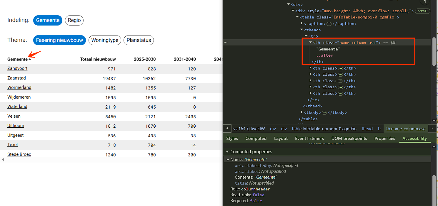 Sorteerknop heeft geen toegankelijke naam, rol en status