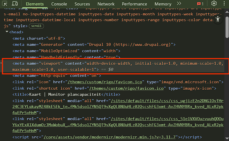 Op alle pagina’s staat in het head-element van de HTML-code maximum-scale=1. Deze code zorgt ervoor dat een bezoeker niet kan inzoomen.