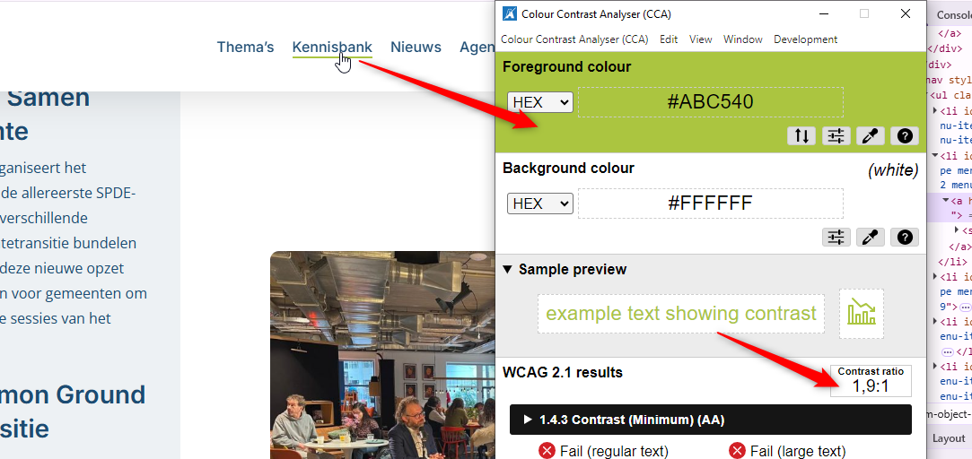 Op veel pagina’s van de website wordt de combinatie van wit en groen (#ABC540) gebruikt. De contrastratio is 1,9:1 en voldoet niet aan de minimaal vereiste waarde. Enkele voorbeelden, dit is geen volledige lijst:
