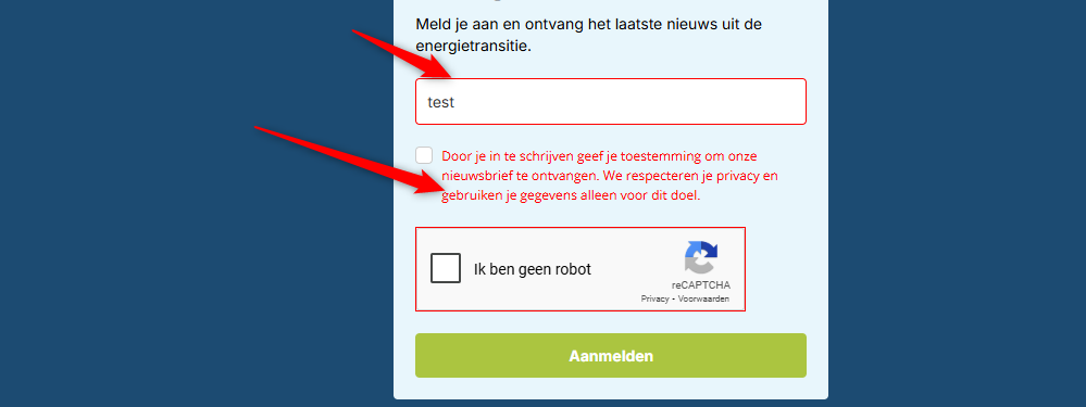 In de footer staat een inschrijfformulier. Wanneer het formulier wordt verzonden met een leeg veld “Email” en niet-aangevinkte selectievakjes, bestaat de foutmelding alleen uit de kleurverandering van de rand van het veld en de tekst van het label.