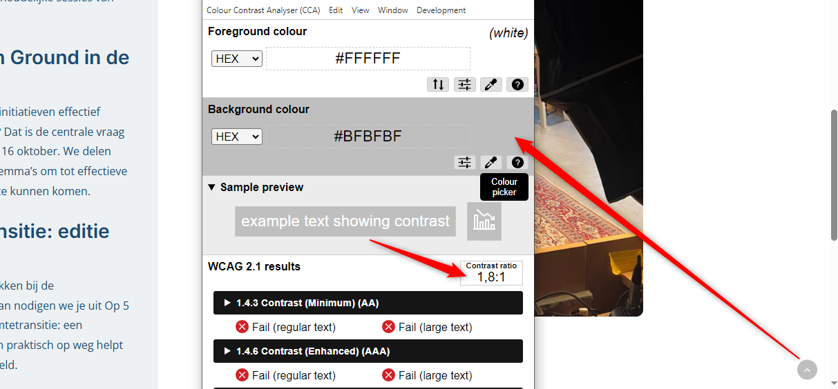 Omdat het hier om grote tekst gaat, moet de contrastverhouding minimaal 3,0:1 zijn.