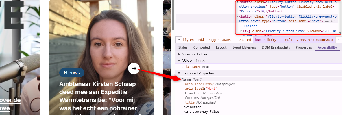 Op verschillende pagina’s van de website zijn er elementen met toegankelijke namen in het Engels, terwijl de rest van de website in het Nederlands is. Ze moeten in dezelfde taal staan als de primaire inhoud van de website. Enkele voorbeelden, dit is geen volledige lijst: * op alle pagina’s de knop “Back to top”