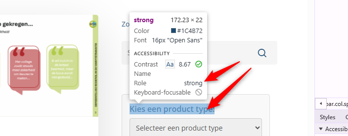 Op deze pagina worden strong-elementen verkeerd gebruikt voor opmaakdoeleinden in de labels "Kies een product type:" en "Kies een onderwerp:".