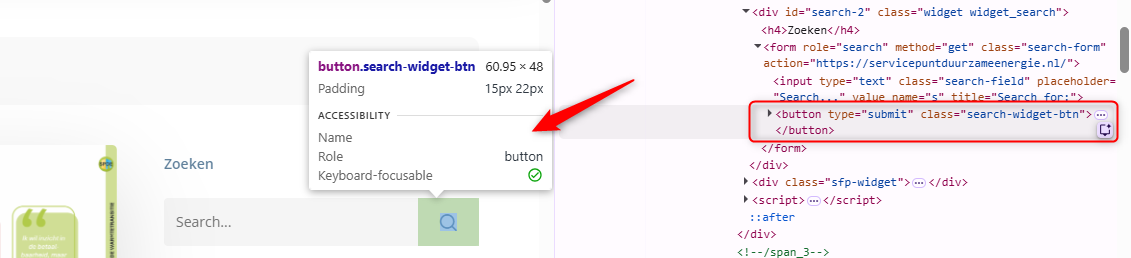 Op deze pagina bevat het zoekveld een knop met een zoekicoon zonder alternatieve tekst. Dit schendt ook succescriterium 4.1.2 omdat de zoekknop geen toegankelijke naam heeft.