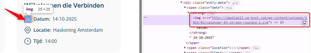 Op deze pagina hebben alle agendapunten iconen van een kalender, een locatiepin en een klok. Deze afbeeldingen zijn toegevoegd met img-elementen, maar de alt-attributen ontbreken. Elk img-element moet een alt-attribuut hebben.