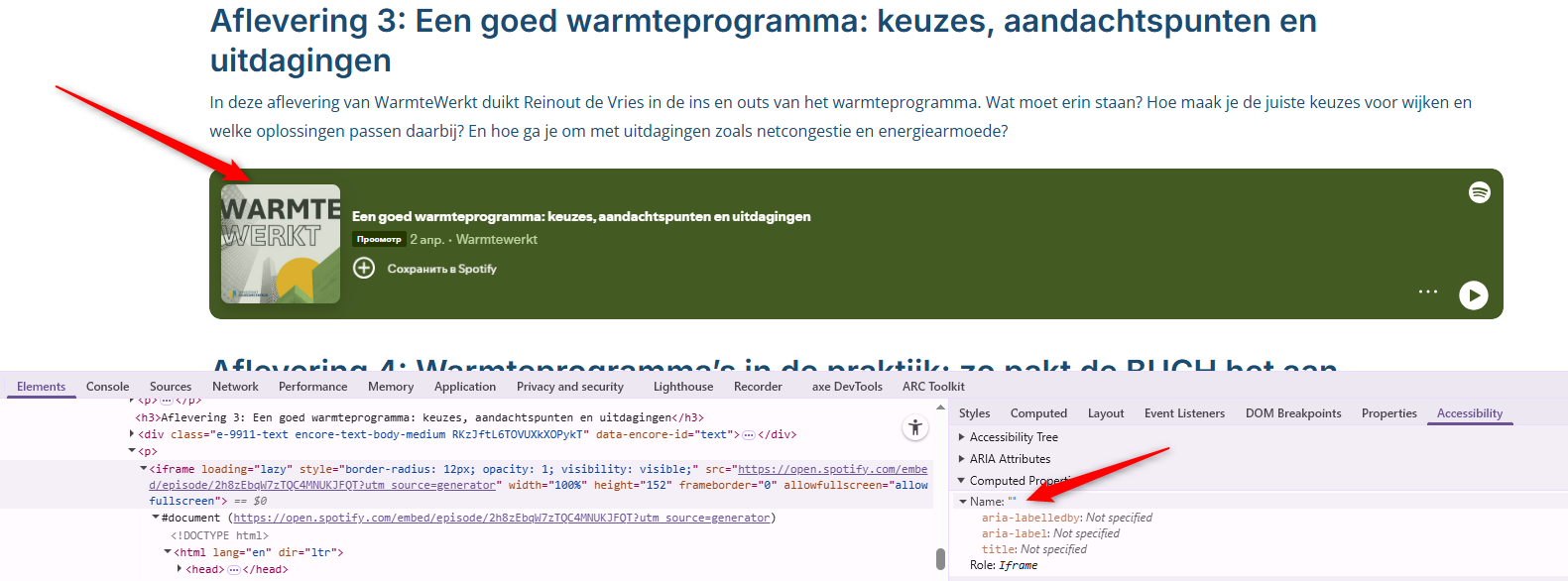 Op deze pagina staan meerdere iframes. Drie daarvan hebben geen beschrijving die zichtbaar is voor schermlezers omdat het title-attribuut ontbreekt. Dit zijn de iframes onder de koppen “Aflevering 3”, “Aflevering 4” en “Aflevering 5”.