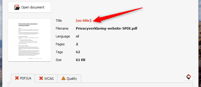 Zelfs als er een titel op de eerste pagina staat, moet je in de PDF-instellingen ook een documenttitel instellen. Als je een pdf opent in een pdf-lezer (zoals Adobe Acrobat of een browser), zie je de bestandsnaam meestal bovenaan in de titelbalk, bijvoorbeeld document123.pdf. Maar als je een documenttitel in de pdf-metadata instelt, dan wordt die titel in plaats van de bestandsnaam getoond. Dit maakt het document toegankelijker voor bezoekers met verschillende beperkingen. Zij kunnen dan snel en gemakkelijk zien of het document relevant is.