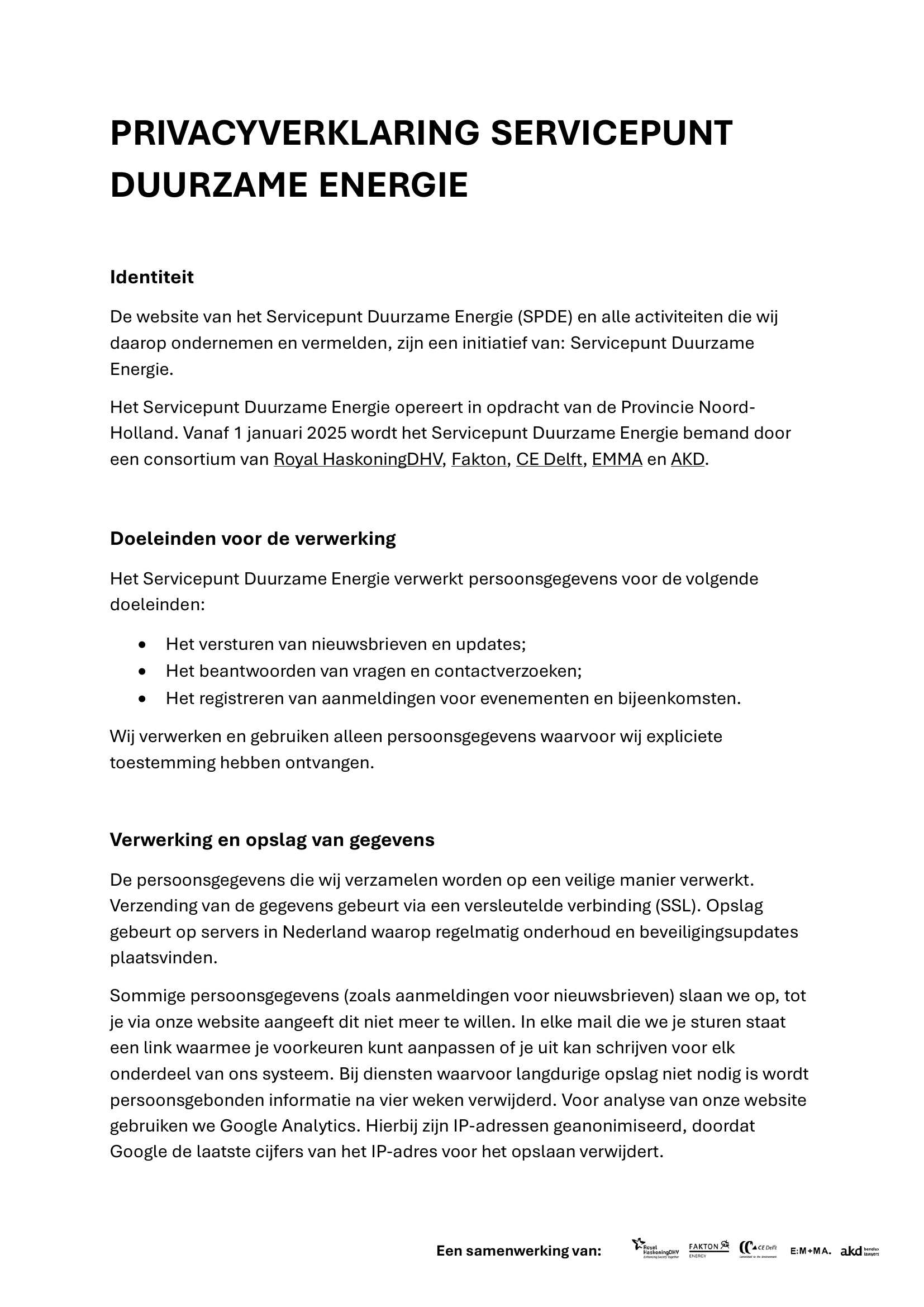 In dit pdf-document zijn alle koppen niet gemarkeerd als koppen. Zie bijvoorbeeld "PRIVACYVERKLARING SERVICEPUNT DUURZAME ENERGIE", "Identiteit", "Doeleinden voor de verwerking" en andere koppen.