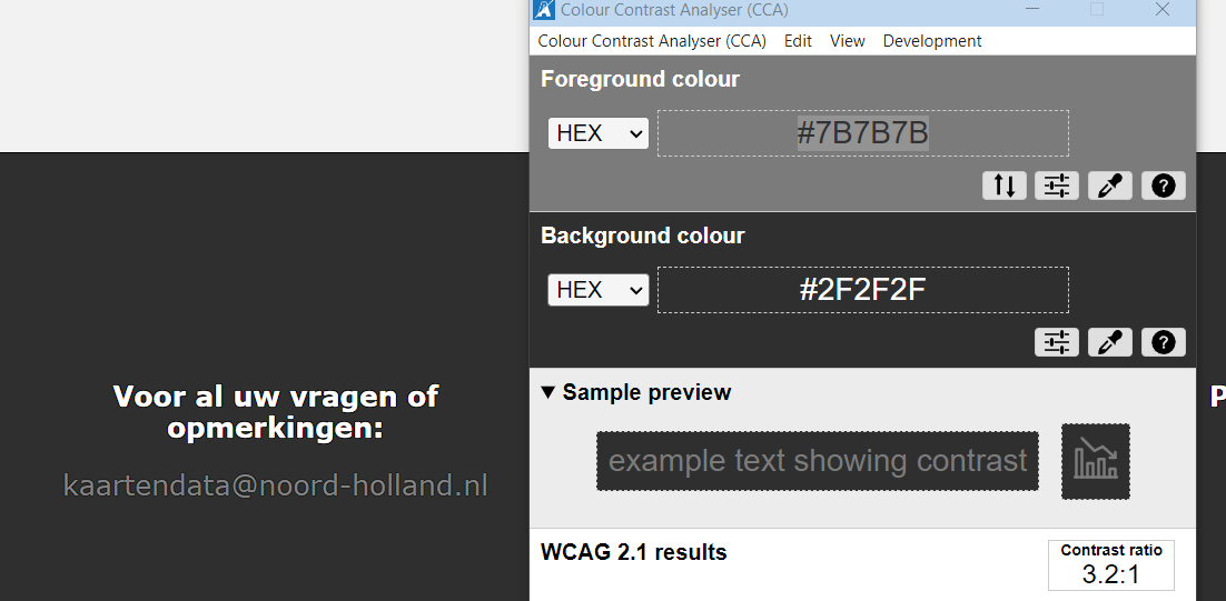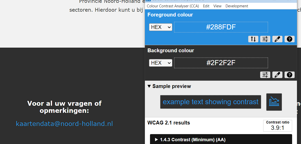Op deze pagina staat in de footer een lichtblauwe (#288FDF) link “kaartendata@noord-holland.nl” op een zwarte (#2F2F2F) achtergrond. De contrastratio is te laag: 3,9:1.