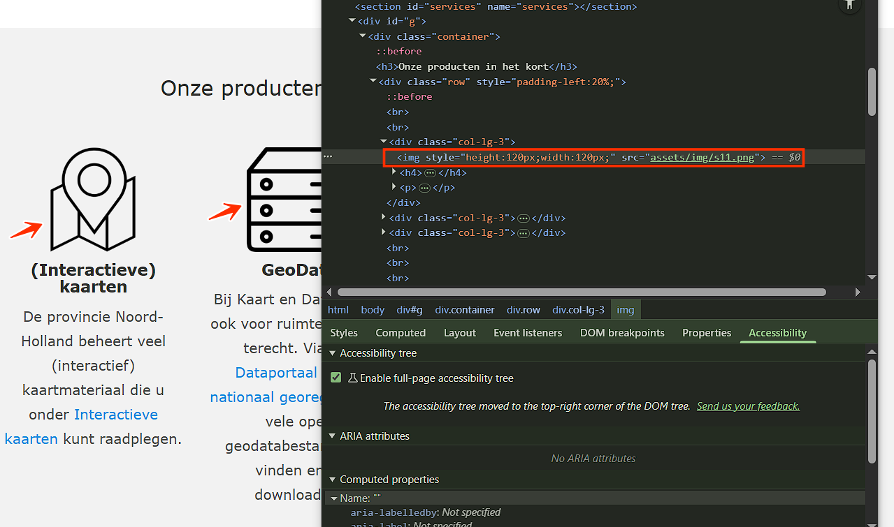 Op deze pagina staan onder de kop “Onze producten in het kort” decoratieve afbeeldingen die een img-element gebruiken, maar het alt-attribuut ontbreekt. Een img-element moet altijd een alt-attribuut hebben.