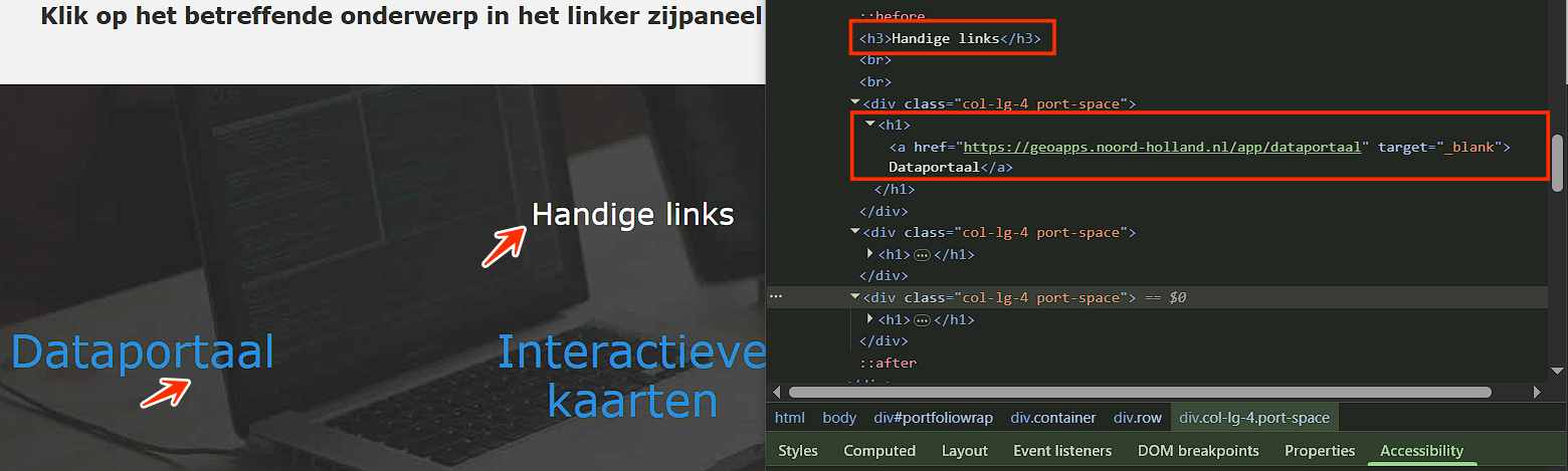 Op deze pagina wordt een kop van niveau 3 direct gevolgd door een andere kop van een hoger niveau. Zie “Handige links” en “Dataportaal”.