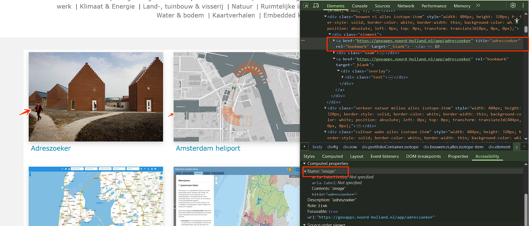 Om de links toegankelijk te maken, kunt u de tekstalternatieven van de afbeeldingen aanpassen zodat ze het doel van de link beschrijven, bijvoorbeeld door zichtbare tekst zoals “Adreszoeker” en andere toe te voegen aan het alt-attribuut.