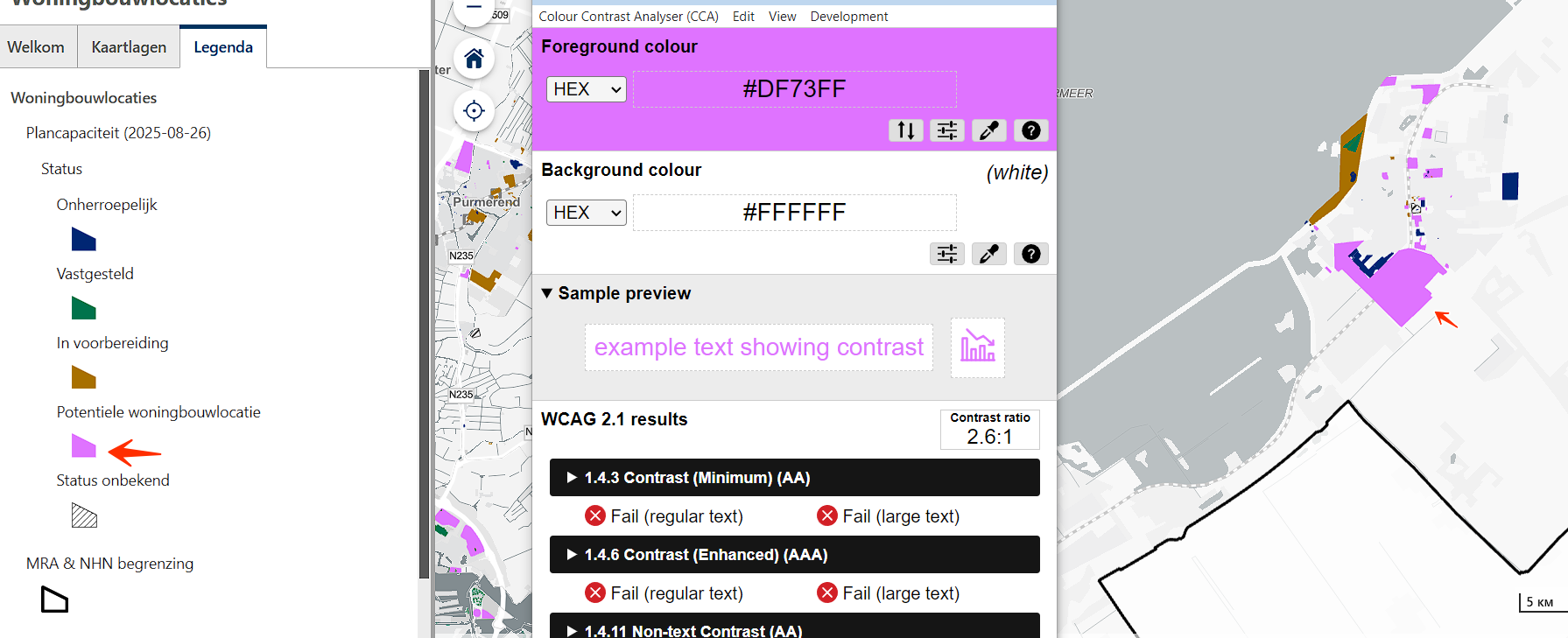 Op deze pagina staat een kaart met een legenda. Sommige kleurcombinaties hebben onvoldoende contrast. Bijvoorbeeld een lichtpaarse (#DF73FF) kleur op een witte achtergrond. De contrastratio is te laag: 2,6:1.