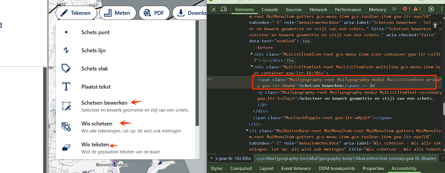 Op deze pagina staan boven de kaart knoppen die extra inhoud openen, bijvoorbeeld “Tekenen”. In deze extra inhoud zijn teksten zoals “Schetsen bewerken” en andere niet als koppen opgemaakt.