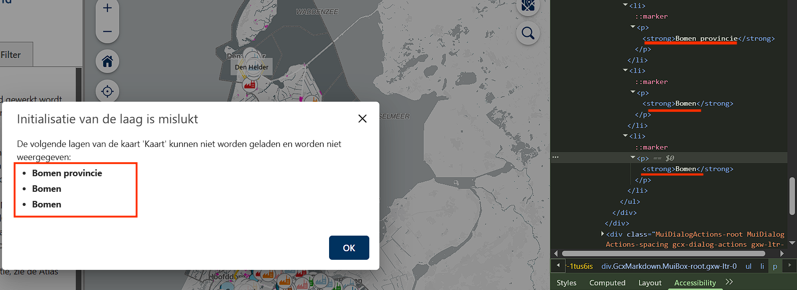 Na het laden van deze pagina verschijnt een dialoogvenster. In dit dialoogvenster wordt het strong-element onjuist gebruikt voor opmaakdoeleinden, bijvoorbeeld bij “Bomen provincie”.