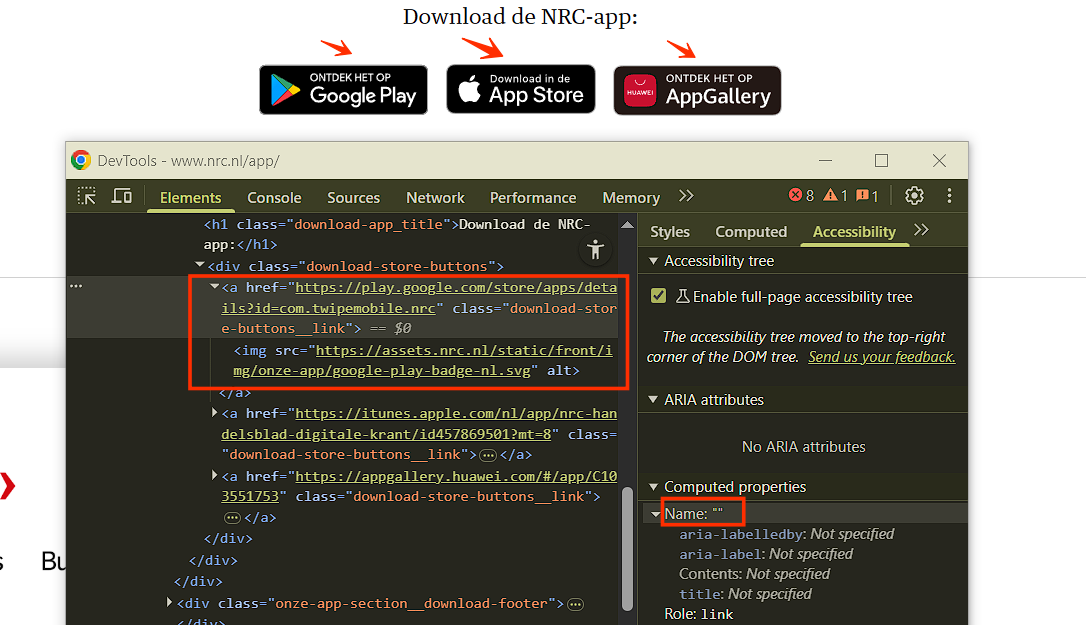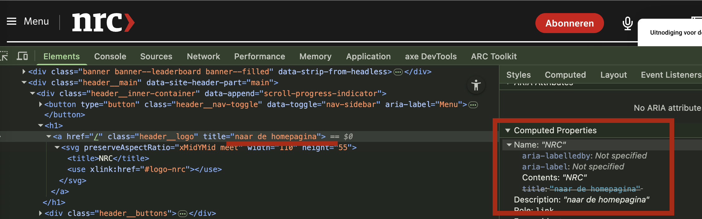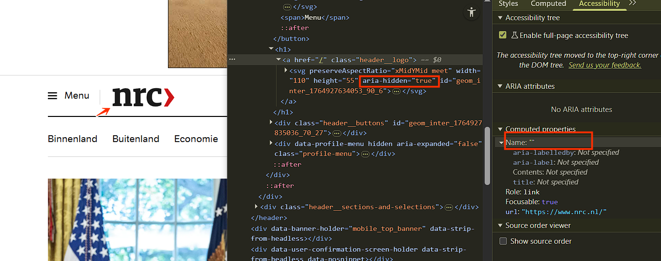 Op alle pagina’s is een link met het ‘NRC’-logo aanwezig. Dit logo is een SVG-afbeelding die met aria-hidden="true" is verborgen voor hulpsoftware. Hierdoor heeft de link geen toegankelijke naam (succescriterium 4.1.2), geen duidelijk doel (succescriterium 2.4.4) en is niet te bedienen met spraakbediening (succescriterium 2.5.3).