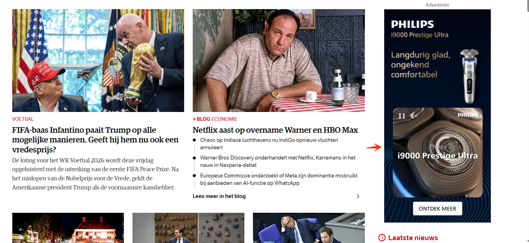 De homepage bevat een iframe met reclame zonder een beschrijving die door een schermlezer kan worden voorgelezen. Het title-attribuut ontbreekt.