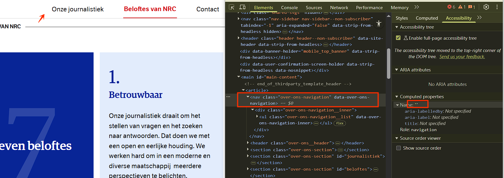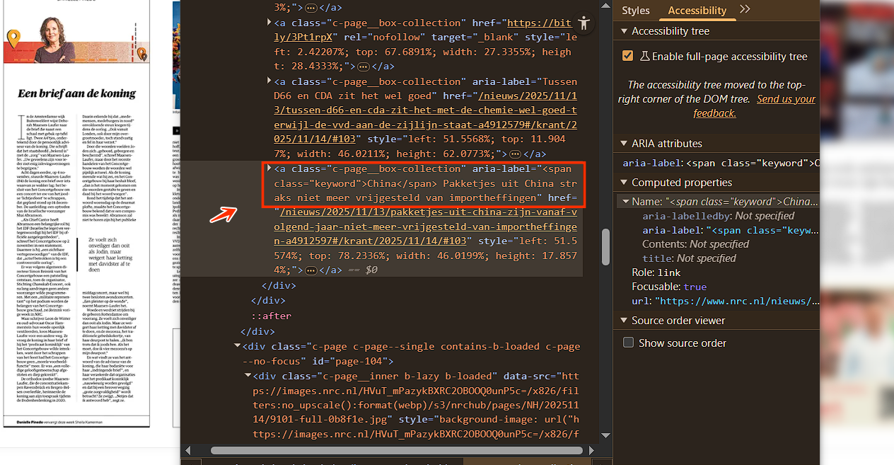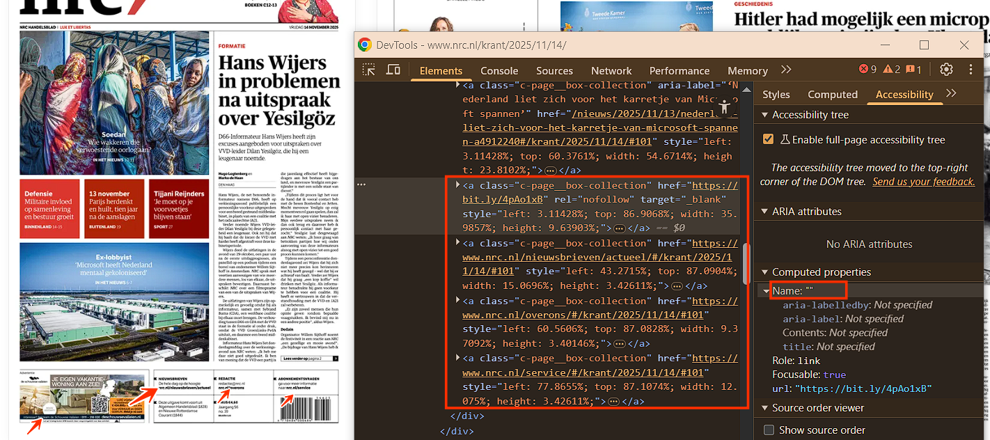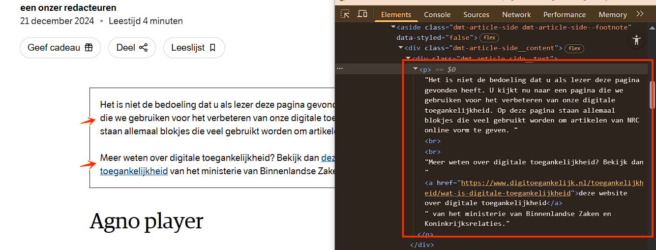 Dit probleem komt voor op de pagina: https://www.nrc.nl/nieuws/2024/12/21/testpagina-voor-digitale-toegankelijkheid-deel-2-a4912961 boven de tekst “Meer weten over digitale … Zaken en Koninkrijksrelaties.”