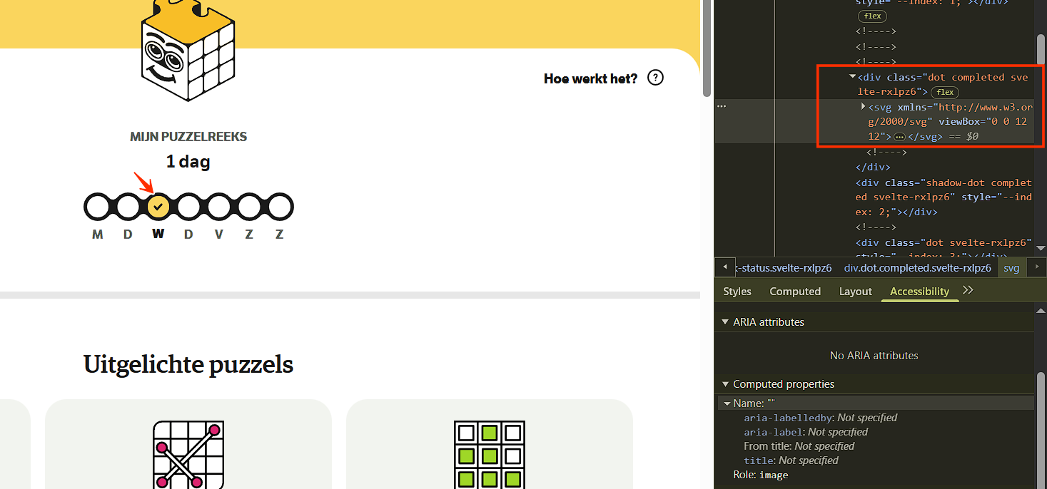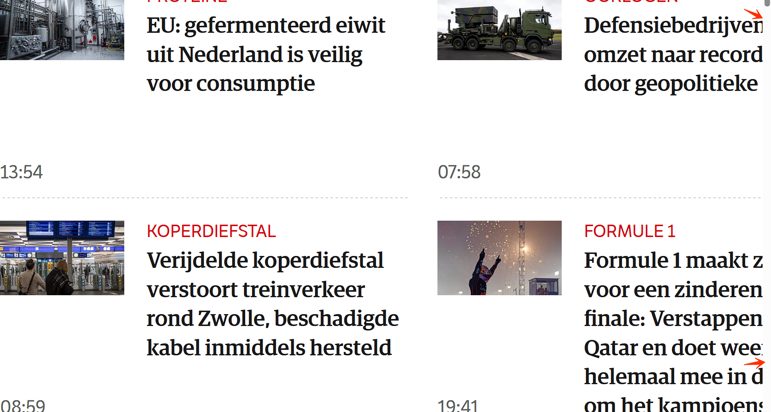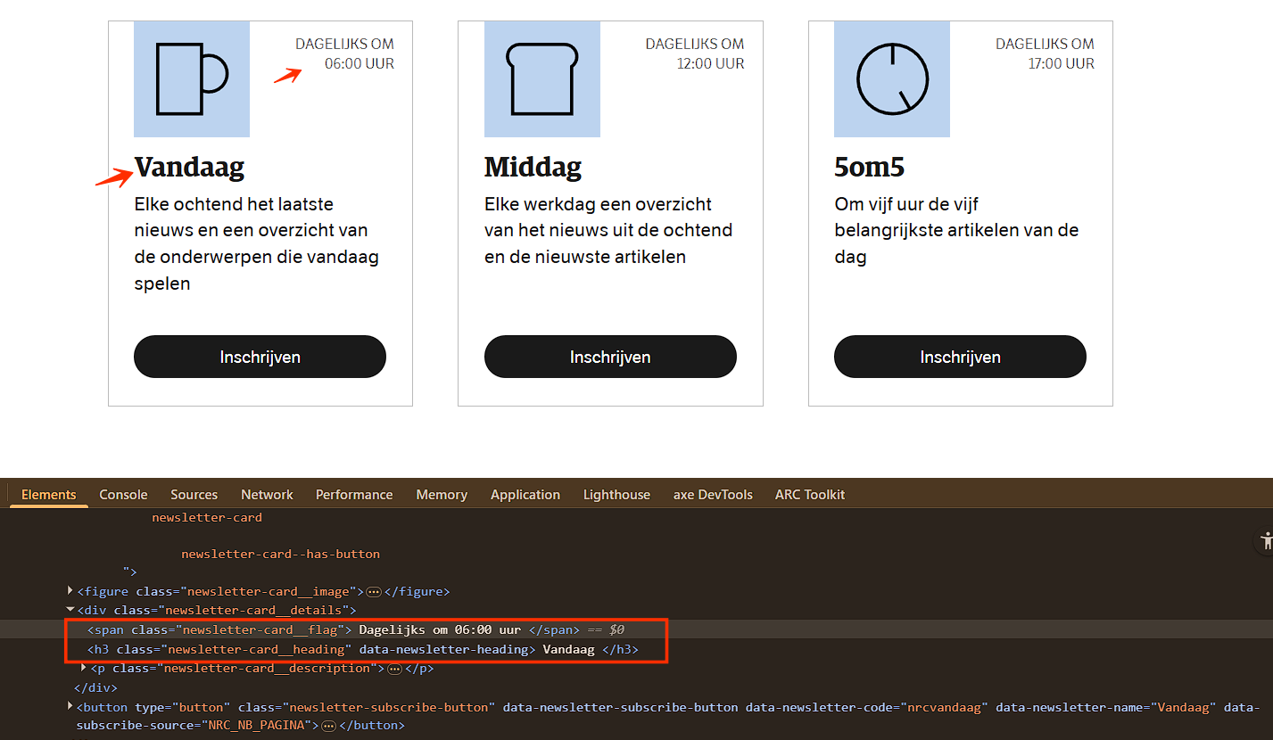 Op deze pagina is de volgorde van HTML-elementen binnen artikelen niet logisch. De tekst staat boven de koppen, bijvoorbeeld boven de kop “Vandaag” staat de tekst “Dagelijks om 06:00 uur”. De huidige volgorde is: tekst, kop, tekst.