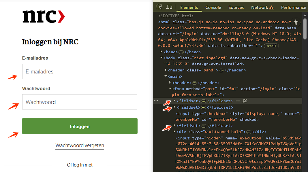 Dit probleem komtvoor op de pagina https://www.nrc.nl/nieuwsbrieven/ na het klikken op de “Inschrijven”-knoppen onder de koppen “De hele dag op de hoogte. Kies je moment(en).”, “Kies de thema's van jouw interesse” en onder andere koppen.