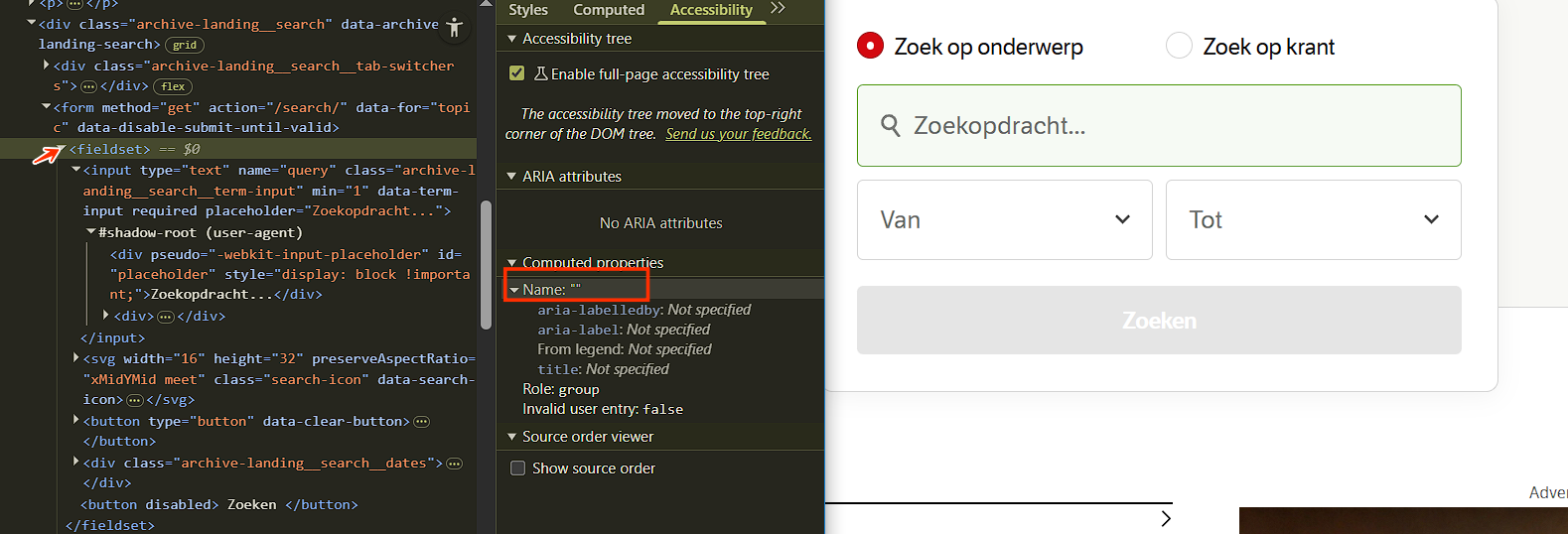 Dit probleem hangt ook samen met succescriterium 2.5.3, omdat de zichtbare tekst niet in een toegankelijke naam wordt weergegeven en het invoerveld daardoor niet met een spraakbediening kan worden bediend.
