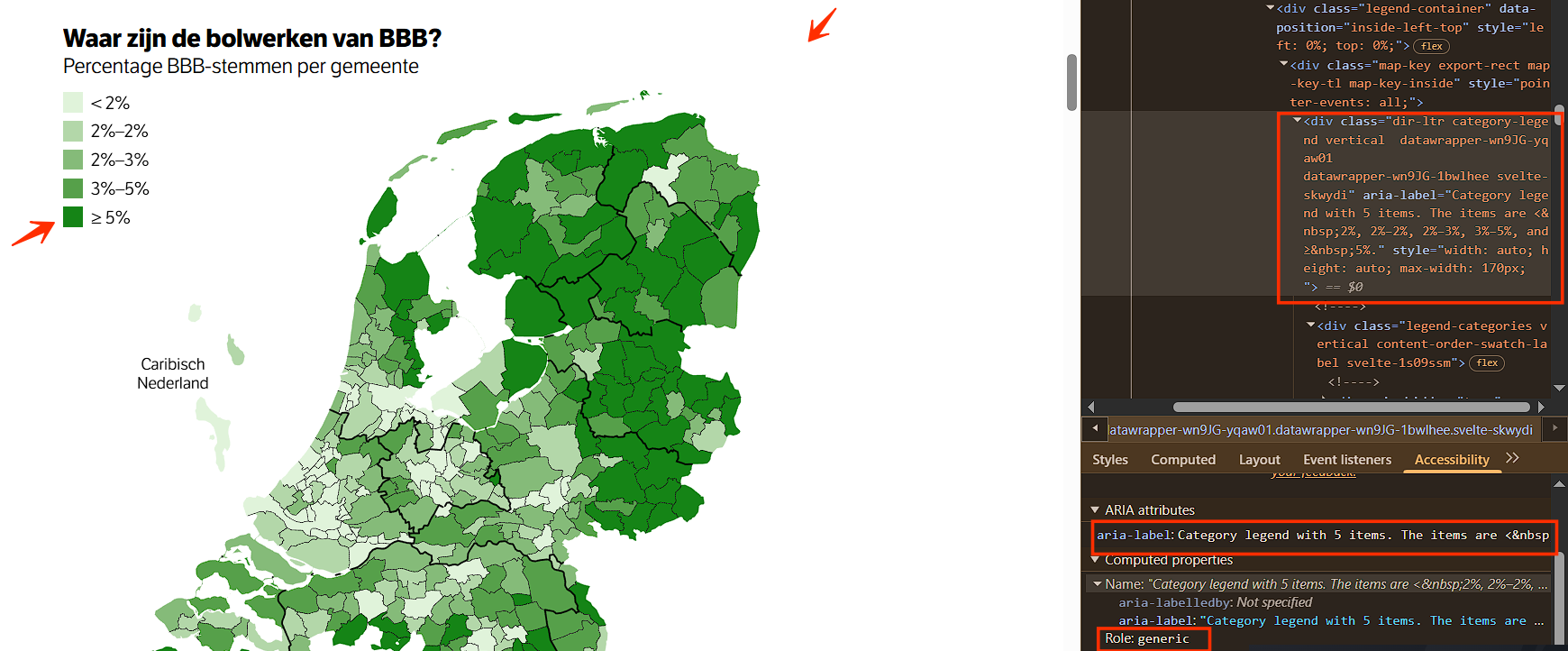 Op deze pagina, onder de kop “Waar zijn de bolwerken van BBB?”, staat een interactieve kaart met een legenda. Deze legenda heeft een aria-label-attribuut met de tekst “Category legend with 5 items. The items are < 2%, 2%–2%, 2%–3%, 3%–5% and ≥ 5%.” Het aria-label-attribuut mag echter niet worden gebruikt in een div-element. Het wordt dan niet voorgelezen. Dit probleem doet zich voor bij de kaart zelf.