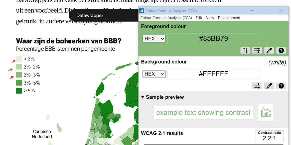 Op deze pagina, onder de kop “Waar zijn de bolwerken van BBB?”, staat een kaart met een legenda. Sommige kleuren hebben een lage contrastverhouding, bijvoorbeeld lichte tinten groen op een witte achtergrond, zoals (#85BB79). De contrastverhouding is 2,2:1. Deze kaart is niet bedoeld voor navigatie en valt daardoor onder de uitzondering van de wet.