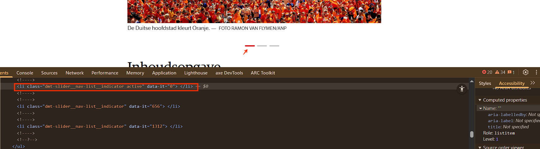 aria-current-attribuut: voeg aria-current=”true” toe aan de knop van de huidige slide.