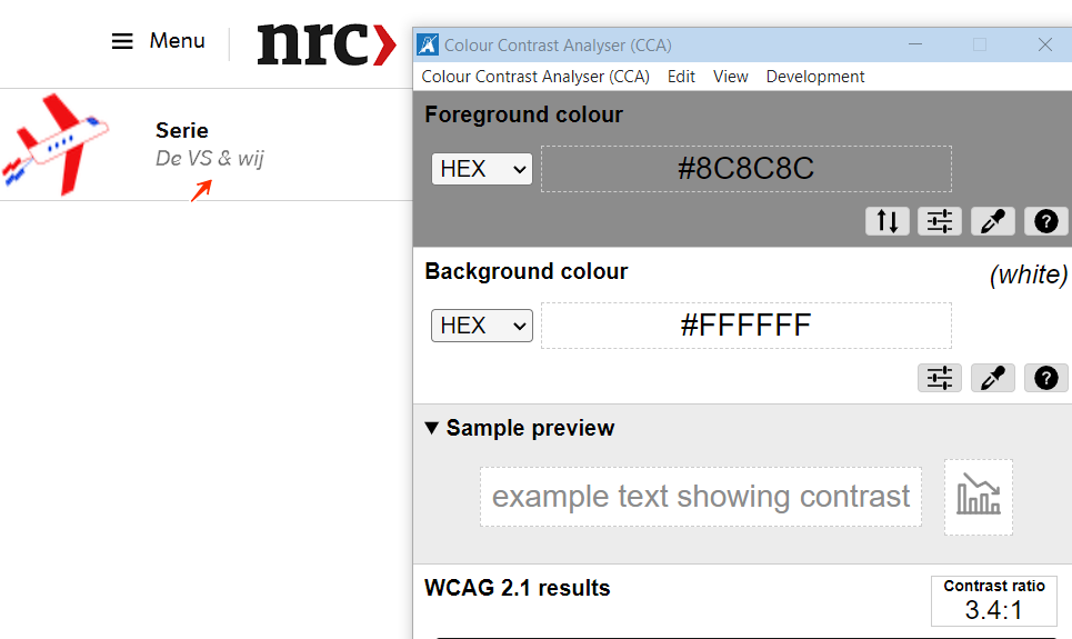Op deze pagina staat grijze tekst (#8C8C8C) “De VS & wij” op een witte achtergrond. De contrastratio is te laag: 3,4:1.