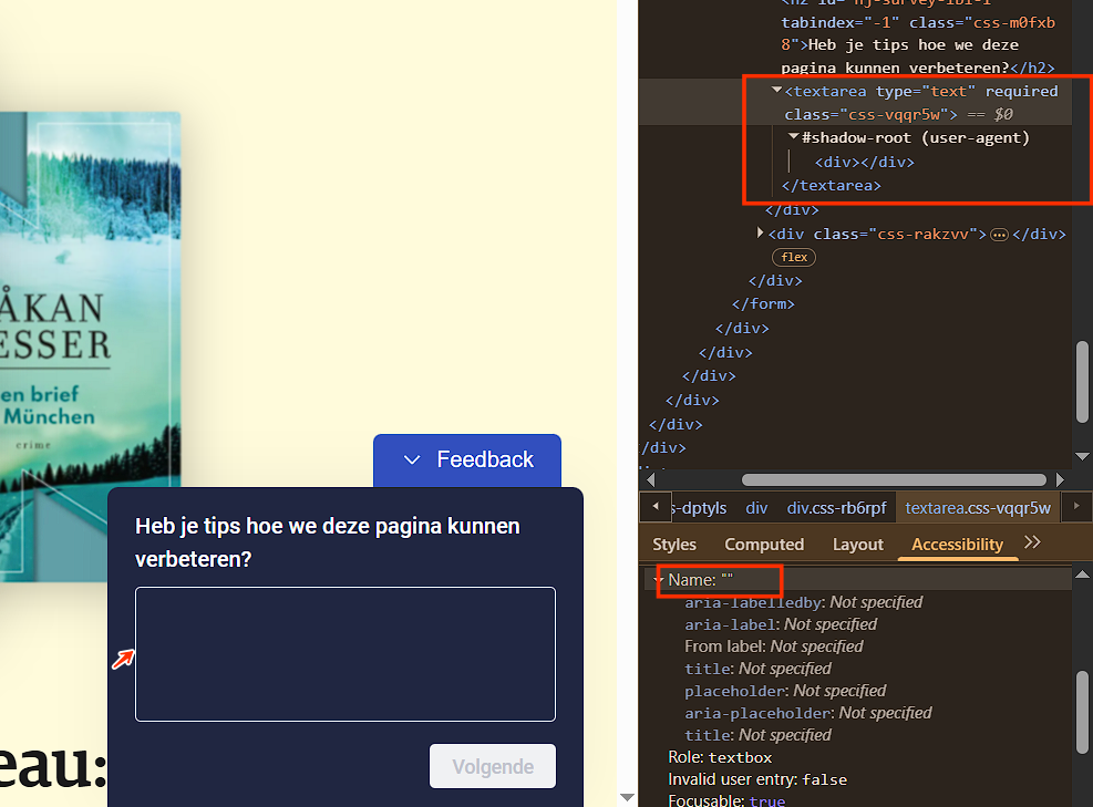 Op deze pagina, onderaan, staat een knop “Feedback” die een dialoogvenster opent met een invoerveld. Dit invoerveld heeft geen toegankelijke naam. Hierdoor is het voor gebruikers van een schermlezer niet duidelijk wat in het veld moet worden ingevuld.