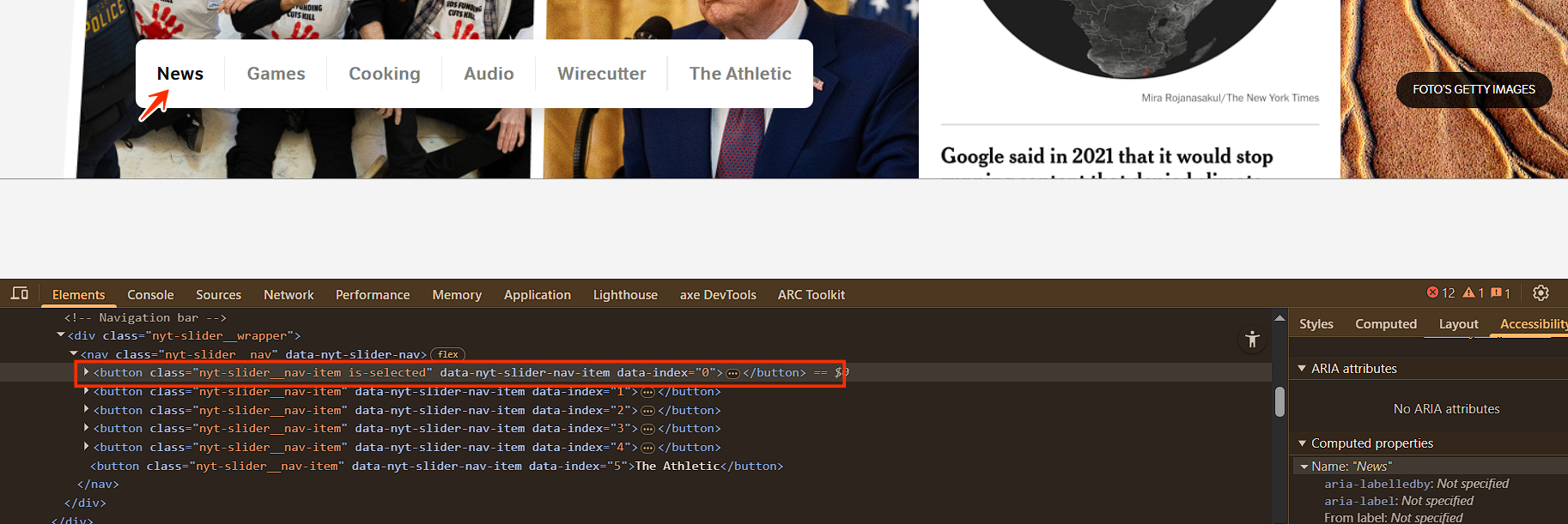 Op deze pagina, onder de kop “Wat krijg ik van The New York Times?”, staat een slider met knoppen. De huidige (actieve) knop wordt alleen visueel weergegeven; er is geen informatie beschikbaar in de HTML-code. Hierdoor kan een schermlezer deze informatie niet doorgeven.