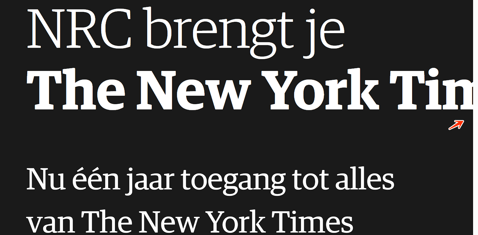 Wanneer deze pagina wordt bekeken bij een schermresolutie van 1280 x 1024 pixels en tot 400% zoom, verdwijnen de kop “NRC brengt je The New York Times” en de tekst onder de kop “Waarom The New York Times?” gedeeltelijk.