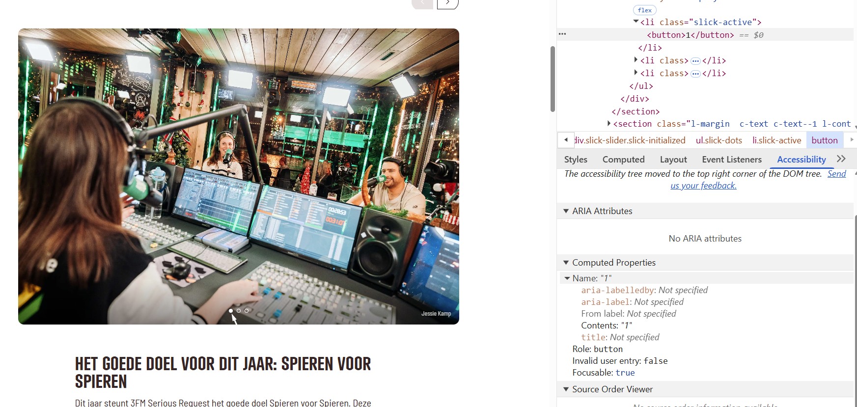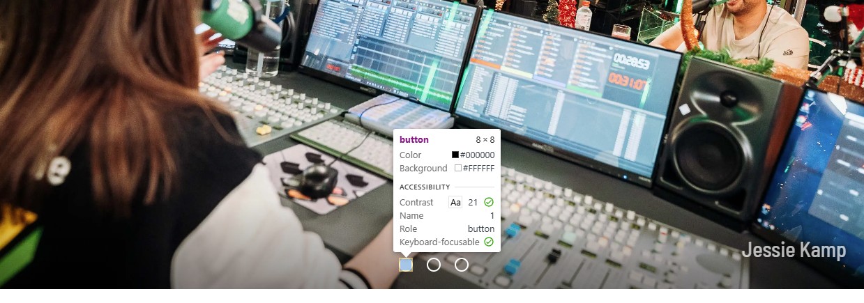 Op deze pagina staat een carrousel met afbeeldingen en knoppen om tussen de afbeeldingen te schakelen. De actieve knop ziet er anders uit dan de knop die niet actief is. Deze informatie ontbreekt in de HTML.