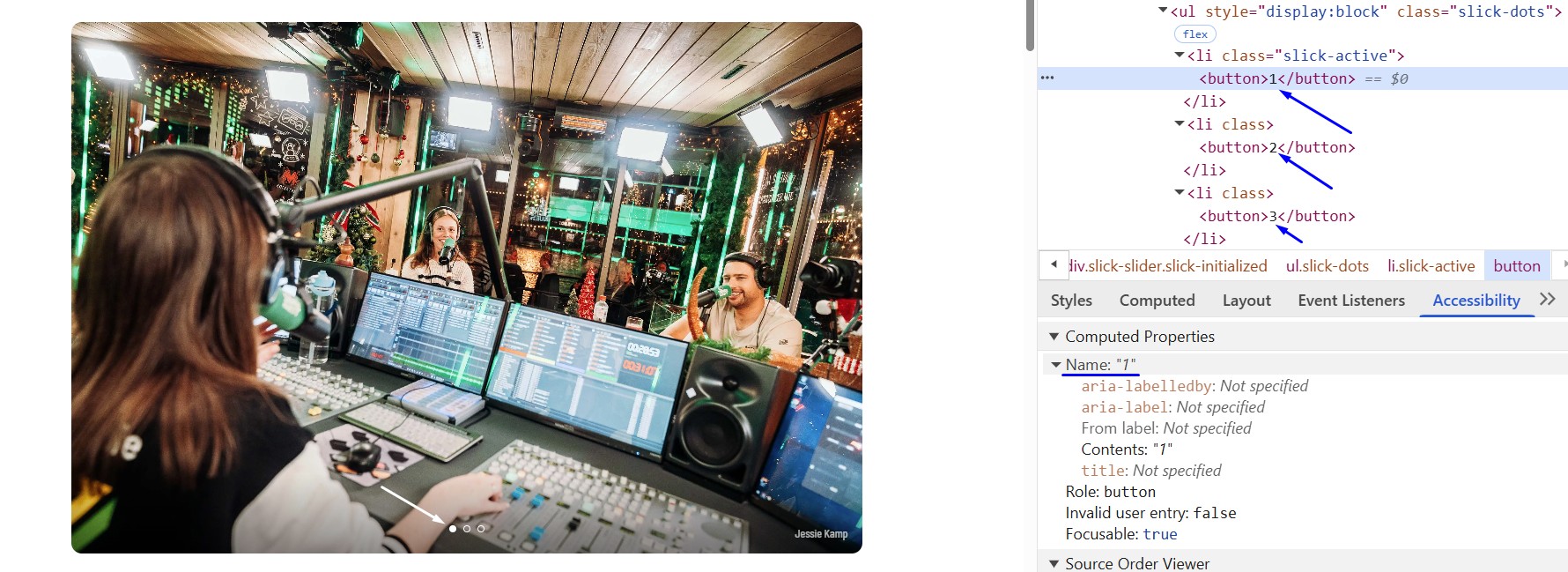 De carrousel heeft knoppen om tussen afbeeldingen te navigeren. Maar de toegankelijke naam is "1", "2", "3", wat de functie niet nauwkeurig beschrijft en niet duidelijk is voor gebruikers met slecht zicht of gebruikers van schermlezers.