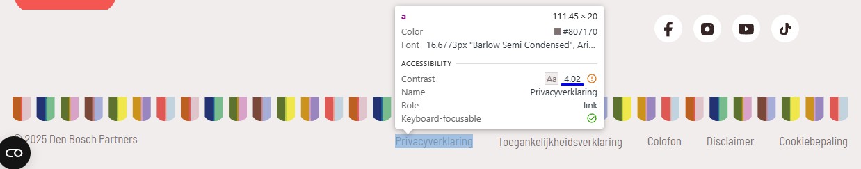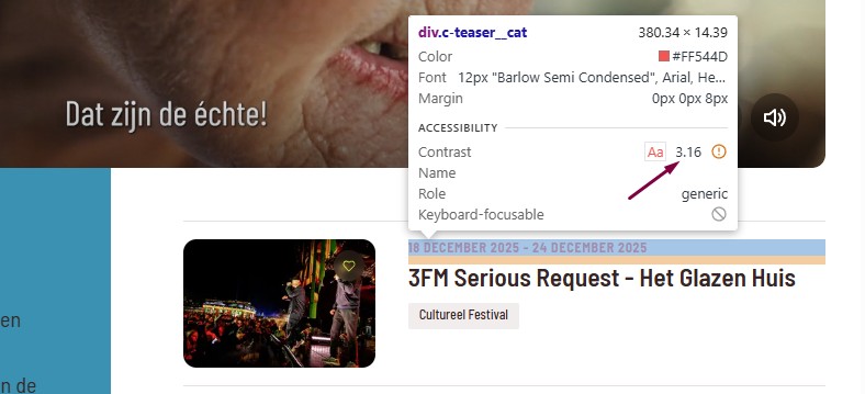 Deze tekst is kleiner dan 19px, daarom moet het contrast met de achtergrondkleur minimaal 4,5:1 zijn. Op deze pagina staat een instructie die uitlegt hoe je kleurcontrast kunt testen: https://properaccess.nl/hoe-test-ik-kleurcontrast/.