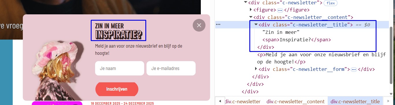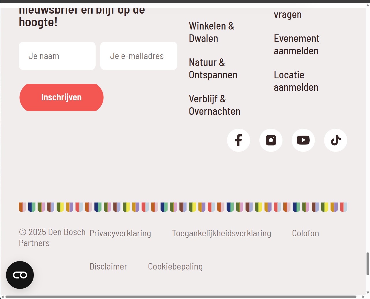 Onderaan alle pagina's, onder de tekst “Meld je aan voor onze nieuwsbrief en blijf op de hoogte!”, staat een formulier. De invoervelden met de placeholder-tekst “Je naam” en “Je e-mailadres” hebben geen permanent label.