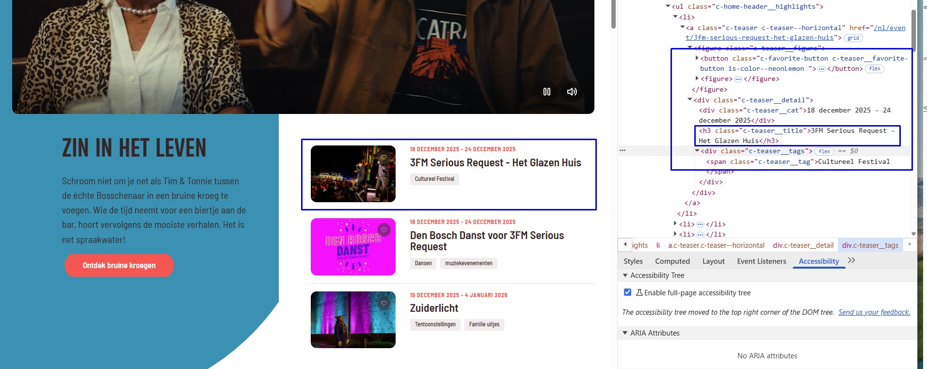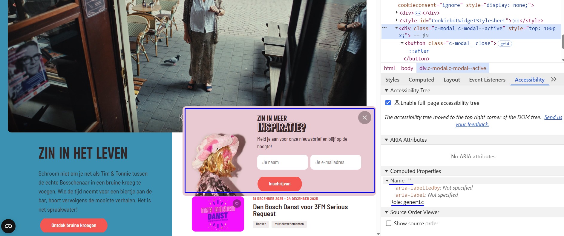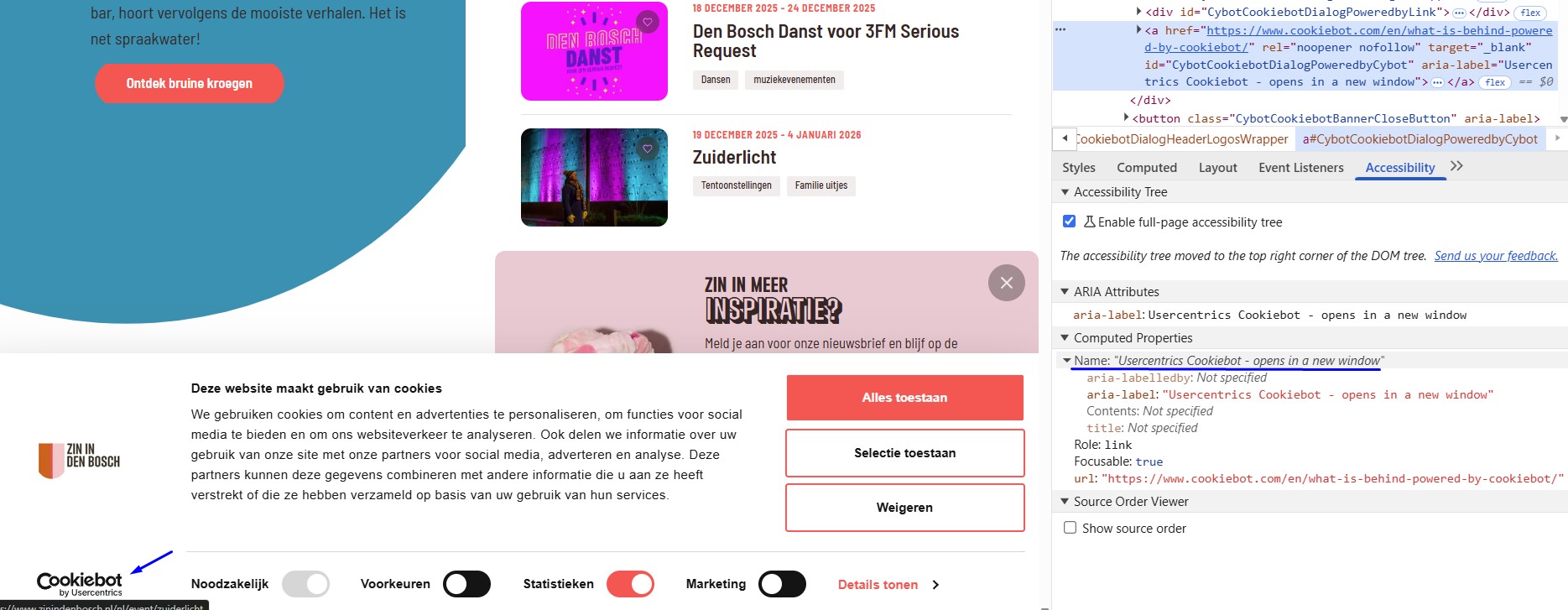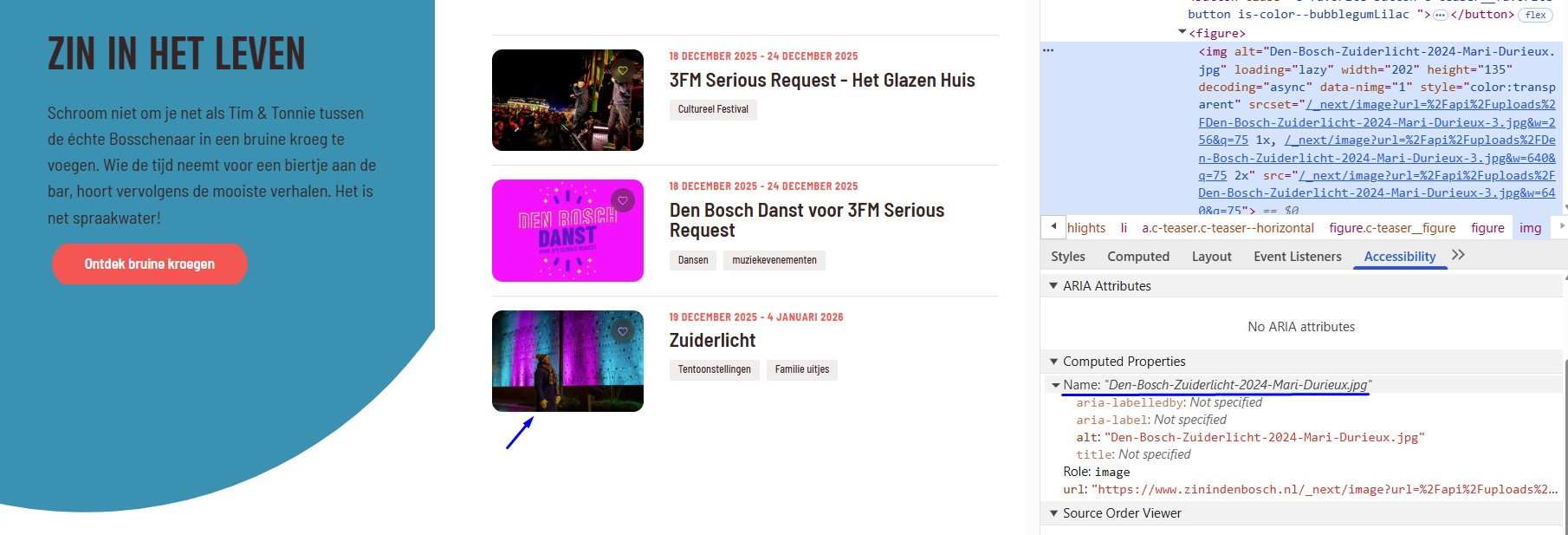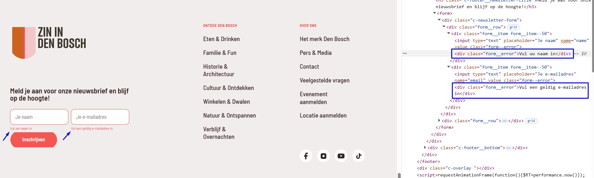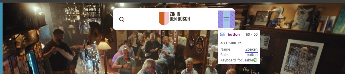 Het logo van de website in de header en de footer heeft tekst “Zin in Den Bosch”. Het tekstalternatief is “zinindenbosch.nl”. Er is een verschil.