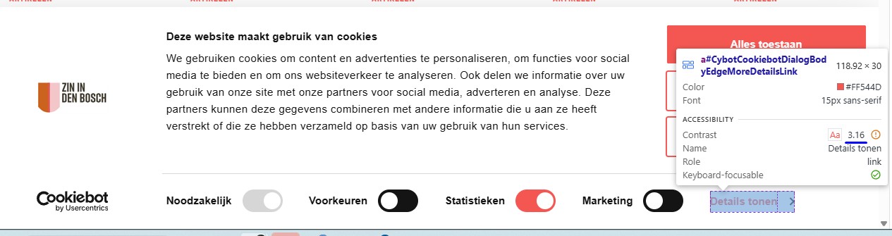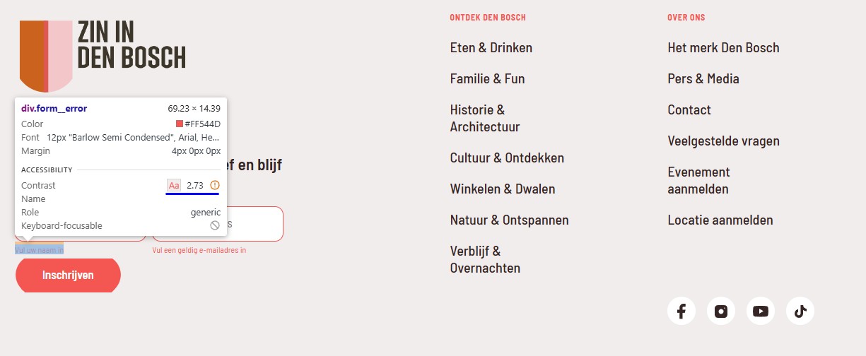 Op pagina https://www.zinindenbosch.nl/nl staat witte tekst “Ontdek bruine kroegen”, “Bekijk Binnenstad”, “Bereikbaarheid” en andere op een rode (#ff544d) achtergrond. De kleurcontrastverhouding is te laag: 3,2:1.